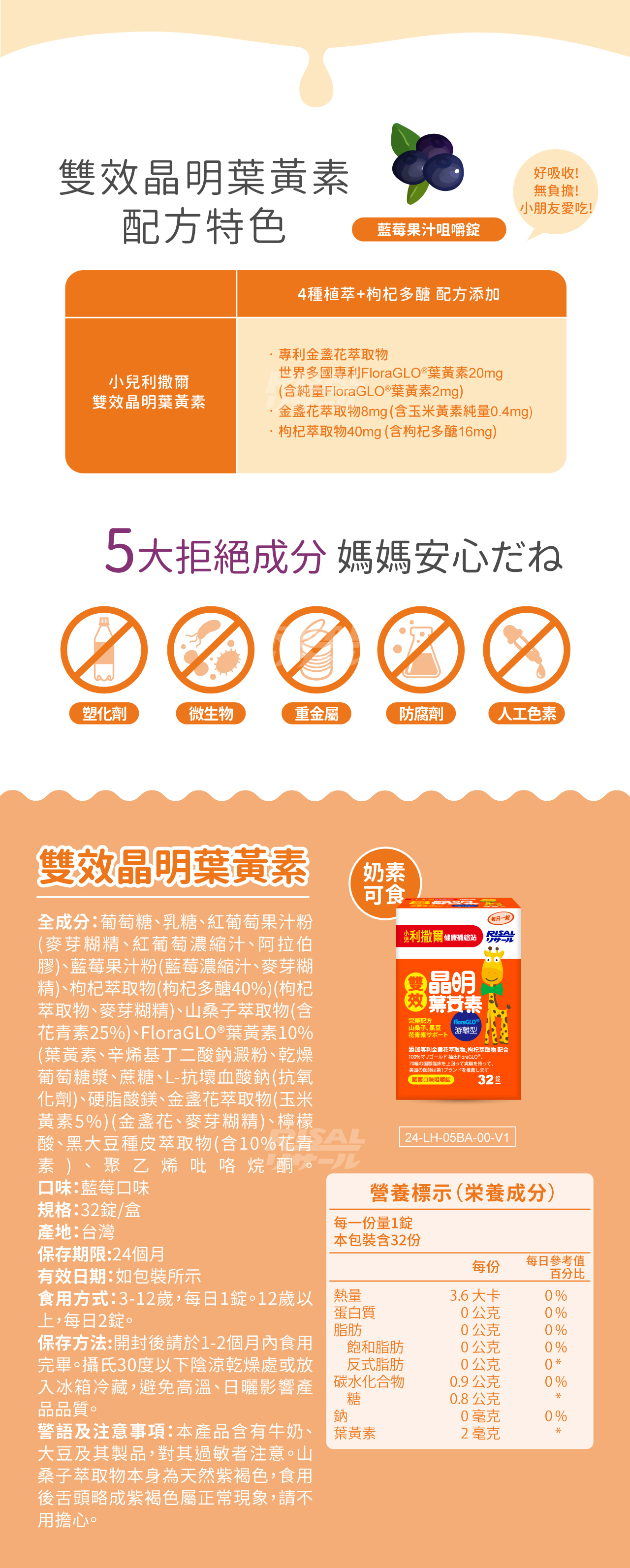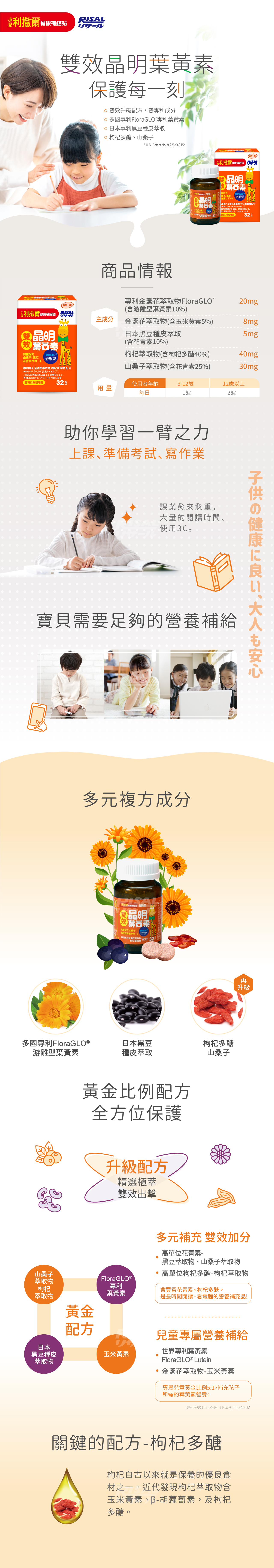 專為學齡兒童設計,添加專利葉黃素、玉米黃素、是經常閱讀、打電腦、看電視兒童的營養補充品。葉黃素是存在於蔬菜水果的一種類胡蘿蔔素,人體無法自行合成,必須由食物或營養補充品中攝取。添加花青素含量高的山桑子、黑豆萃取物、富含枸杞多醣的枸杞萃取物,維持機能健康,元氣滿分。有小朋友喜歡的藍莓果汁口味,健康好吃無負擔。